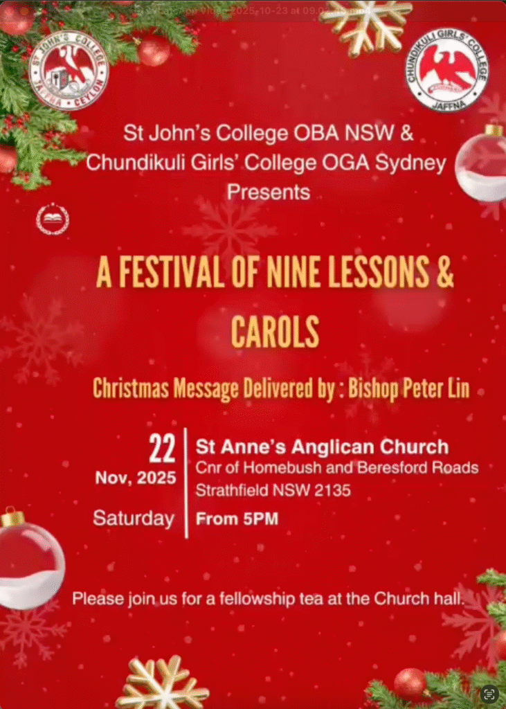 CGC OGA (Sydney) and SJC OBA (NSW) are delighted to announce a combined Carol Service on Saturday, 22 November 2025, 5:00 pm at St. Anne’s Anglican Church, Strathfield. Reviving a cherished tradition from our school days, we invite all members who enjoy singing and know a few traditional carols—regardless of religion—to join the choir.